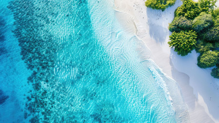 Turquoise waters caress the soft, sandy shore as shadows from palm trees dance in the sunlight, creating a serene tropical retreat.