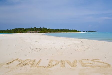 Beach with Maldives text in sand