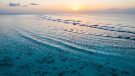An aerial view a tranquil turquoise ocean with gentle waves and visible coral reefs under a soft pastel sunset sky with the sun low on the horizon.