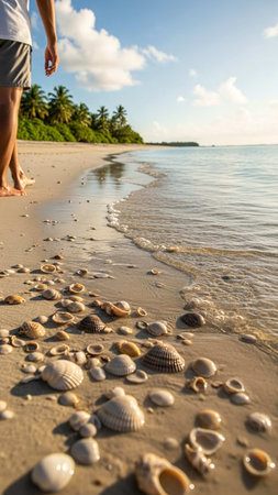 Woman walking on a tropical beach with seashells and palm trees