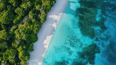 Aerial Drone Image of Shoreline in Maldives. Bright Blue Crystal Clear Water and White Sandy beach. Summer and travel vacation. AI Generated