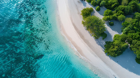 An aerial view captures a stunning tropical beach with clear turquoise waters and lush greenery. Perfect for conveying relaxation and natural beauty.