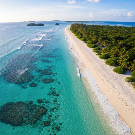 Pristine white sands of a tropical island extending into the horizon, bordered by lush palm trees and crystal-clear sea.