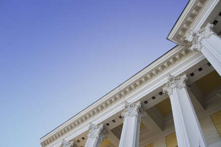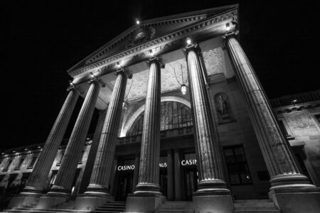 Wiesbaden, Germany - January 31, 2020: the Wiesbaden casino with famous entrance with roman pillars by night.