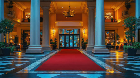 Grand hotel entrance with red carpet, marble columns, and luxury architecture under dramatic lighting. Classic elegance with copy space.