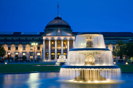 Kurhaus Wiesbaden with fountains at twilight, Hessen, Germany