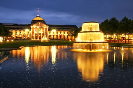Kurhaus and Bowling Green in the evening with lights, Wiesbaden, Hesse, Germany. Wiesbaden is one of the oldest spa towns in Europe
