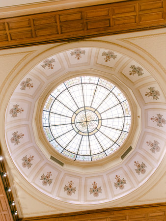 Bright stained glass dome illuminates the interior of a historic building with intricate designs and craftsmanship.