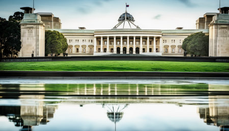 A stately government building with a large reflecting pool in the foreground, surrounded by lush green lawns under a cloudy sky.. AI Generation