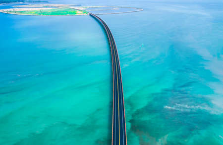 Top down view of beautiful elevated road and tollway surrounded turquoise water. Shot at the sea