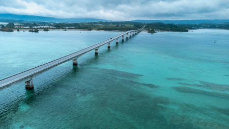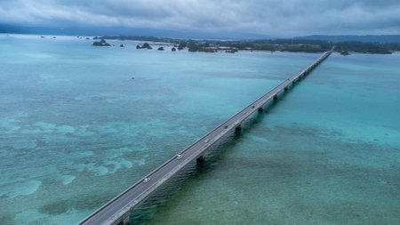 Okinawa, Japan - July 2024 : Long bridge of Kouri Island from high view by drone with clear sky and sea water.