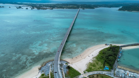 Okinawa, Japan - July 2024 : Long bridge of Kouri Island and beach from high view by drone with clear sky and sea water.