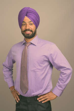Young handsome Indian Sikh businessman wearing turban against gray background