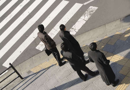 Image of four businessmen group waiting to cross the street in a big (Asian) city.