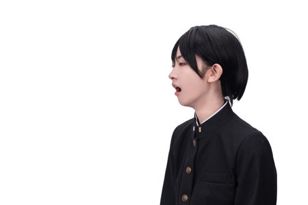 Japan woman in a suit standing in front of a white background