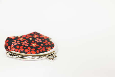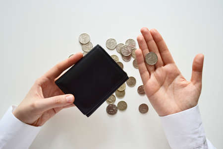 Purse in hand against a background of coins. The concept of financial crisis, the accumulation of money. economic crisis. Strengthening of the ruble.