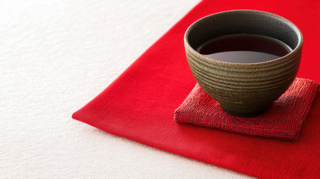 A refreshing Japanese beverage in a traditional cup, placed on a clean surface with minimalist styling, offering space for text or design elements