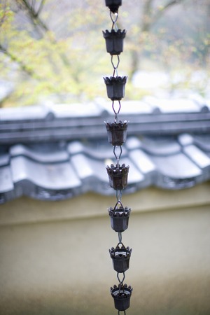 Raindrops create ripples on calm water as traditional structures stand quietly in a lush garden.