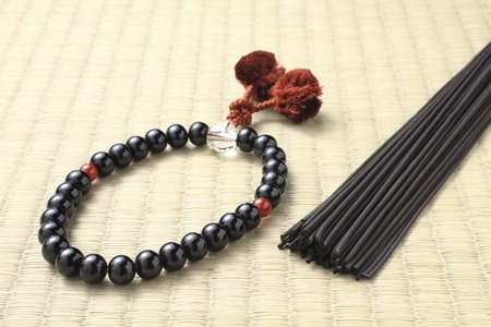 An elegant middle-aged Asian woman wearing a traditional black kimono, sitting in a formal seiza pose on a tatami mat in a serene Japanese room.