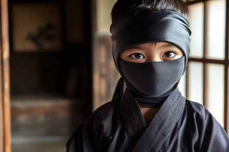 Portrait of a young boy dressed in a ninja costume, capturing the essence of stealth, martial arts, and imaginative play