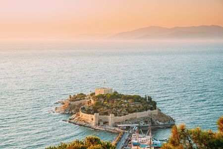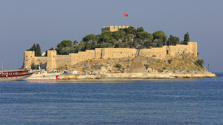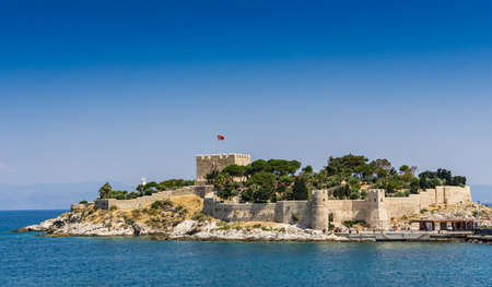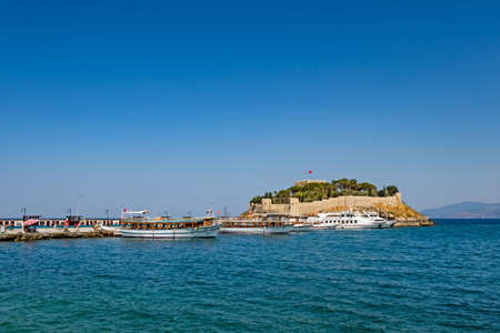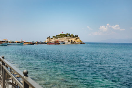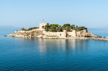 Pigeon Island (Güvercinada) view in Kusadasi, Aydin, Turkey. Historical castle in the island. The walls of the historical castle can be seen on the island. Summer and travel background.