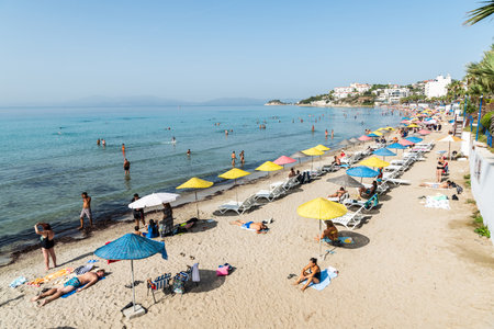 Kusadasi, Aydin, Turkey – October 6, 2020. Kadinlar Denizi (Ladies Beach) beach in Kusadasi, Turkey. View with people on a sunny day.