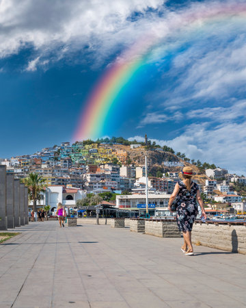 Kusadasi, Aydin, Turkey - August 22, 2021: Colorful Kusadasi houses on the hill with rainbow