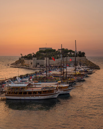 Guvercinada Castle, Pigeon Island, and traditional boats docked in Kusadasi, Turkey. Scenic coastal view under a cloudy sky