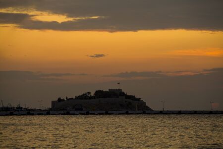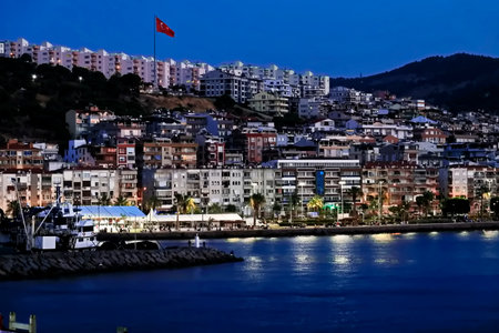 Kusadasi, Turkey - September 17, 2019: View of the coast of Kusadasi, Turkey. Sunset over the port in the tourist town.