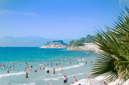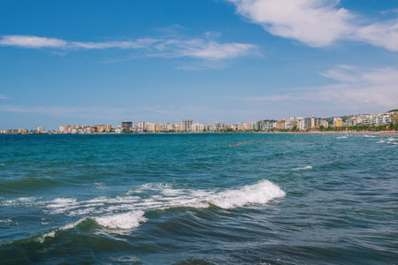 Vlora,Albania - August 7, 2020: summer resort - turquoise sea water and cityscape on the horizon: beach, hotels buildings and blue sky