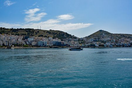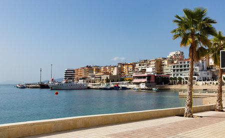 Saranda, Albania - August 5, 2020: city harbor - sea bay with calm turquoise water, ships and ferryboats, cityscape - modern buildings and hotels