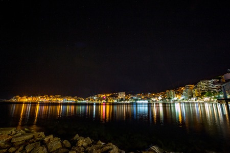 Long exposure night landscape photo, cityscape at the beautiful sea town of Saranda, Albania with star effect of the city lights and sea water reflections
