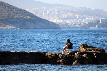 Aegean sea coast in Kusadasi resort town in Turkey. View with an unidentifiable fisherman and Kusadasi castle standing on the Guvercin Adasi (Pigeon Island) in the background.