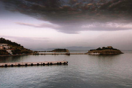 Sarande on the Ionian coastline of southern Albania, part of the Albanian Riviera. Here, the hills of the Ceraunian mountain range meet the Straits of Corfu in the eastern Mediterranean Sea