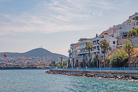 Kusadasi, Turkey - August 02, 2022: Kusadasi seafront promenade. Kusadasi is a city in Aydin Province in Turkey.
