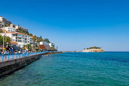 Kusadasi, Turkey - August 23, 2021: Pigeon Island Castle, (Guvercinada castle in Turkish) is a tourist attraction.