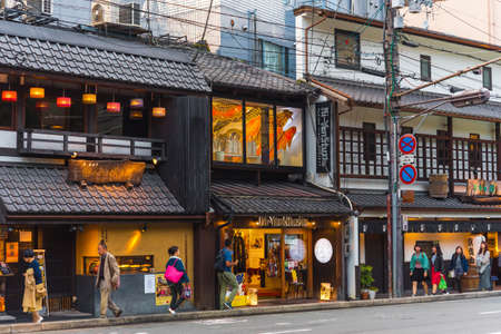 KYOTO, JAPAN - NOVEMBER 7, 2017: View of shops on the city street. Copy space for text