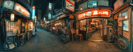 Winding through a bustling Tokyo street at night, dazzling neon signs illuminate rustic eateries and vibrant life, creating an electric atmosphere that enchants visitors.
