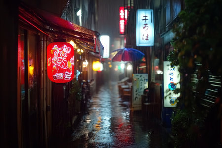 Atmospheric night scene of a narrow Japanese alley with traditional lanterns and neon signs during rainfall.
