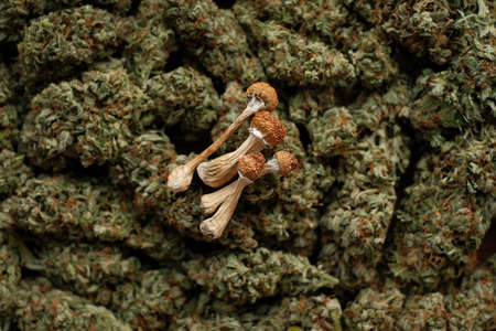 Dried Psilocybin mushrooms on the background of cannabis buds. Natural recreational drug
