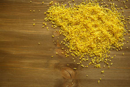 Croup of bulgur placer, pile on a wooden brown background. The product is rich in protein, healthy food, vegetarianism. Yellow and brown. View from above