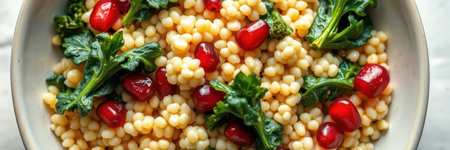 Colorful couscous salad with pomegranate and kale in a rustic bowl on a marble countertop