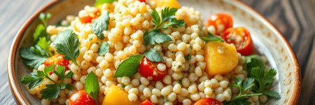 Fresh and vibrant couscous salad with cherry tomatoes and herbs on a rustic wooden table