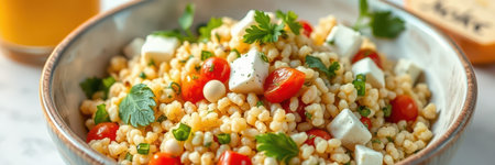 Fresh summer salad with couscous, cherry tomatoes, and feta cheese served in a decorative bowl