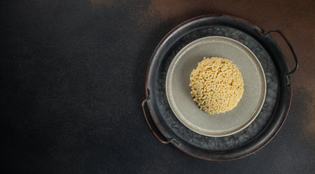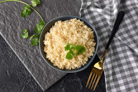 Bowl of raw couscous on dark background