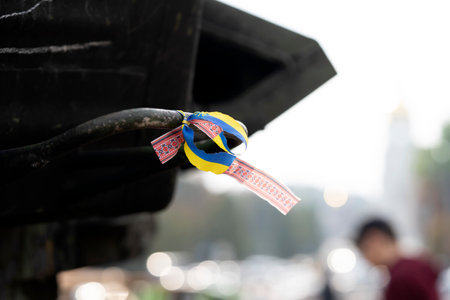 A ribbon with Ukrainian flag on the dark background.