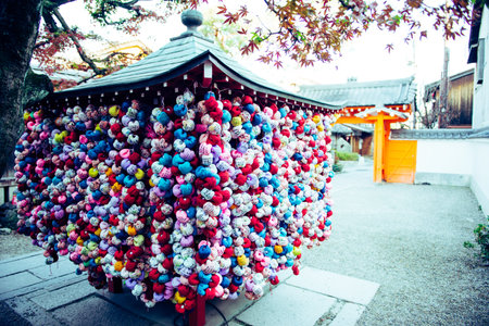 KYOTO, JAPAN - NOVEMBER, 8, 2019: Japanese Geisha Signing Colorful Temple Charm Formed as Colorful Squishy Balls And Made of Cloth At Kyoto Temple
