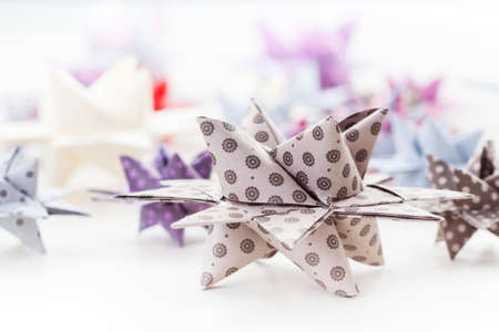 Paper decor star made of colored paper on a light background. Origami snowflake made of paper on a blue background