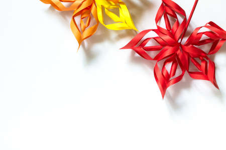 Beautiful colourful folded origami flower on a white shiny textile background