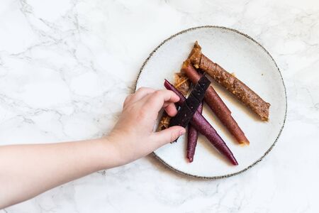 Hand holding Thai fried peanut cookies for asian dessert, food and eating concept